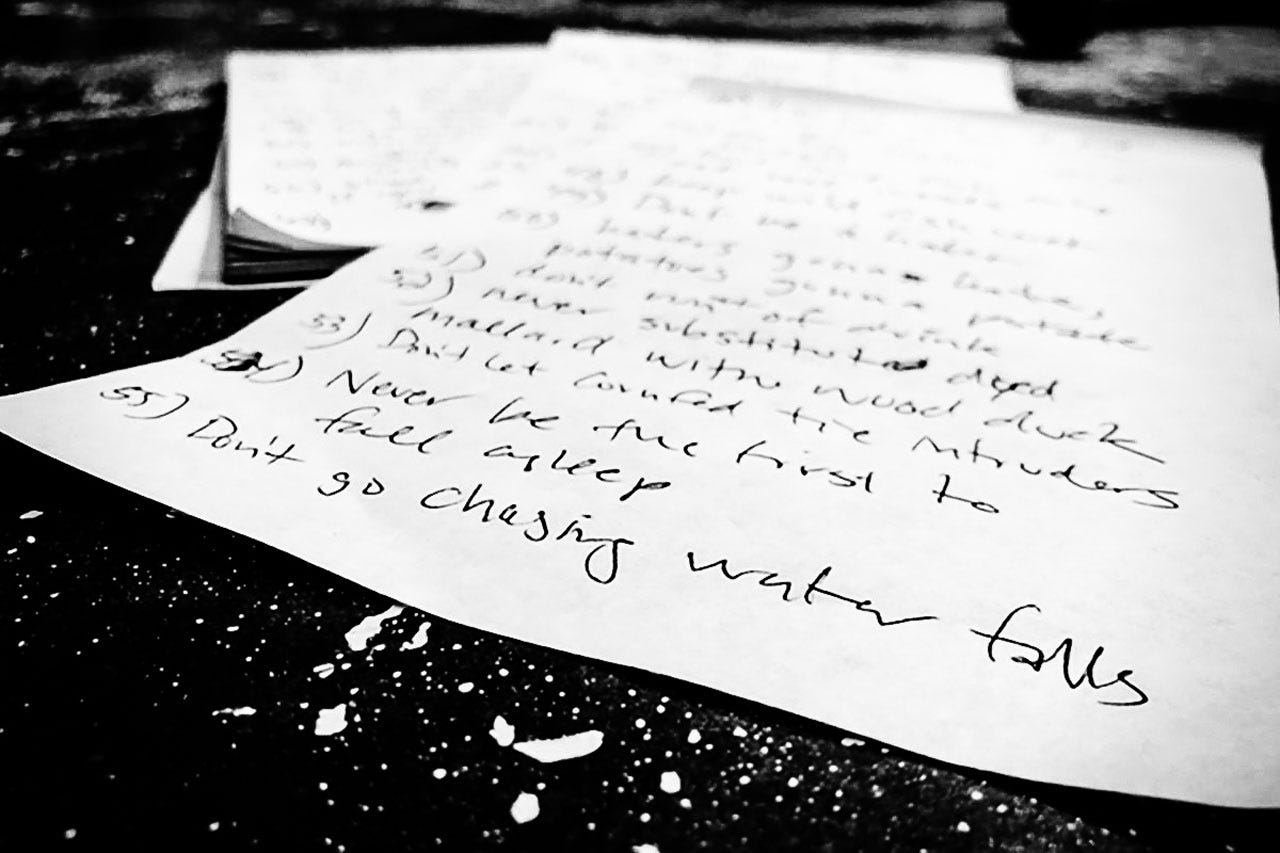 Sometime in the fall of 2015, about a dozen of us were holed up at a river house we rented just down river from Prewitt Creek on the Missouri River in Montana. It was late and we had fished all day, so with our minds at an elevated level we began to brainstorm the rules of fly fishing. For some reason it occurred to me to write everything down that night, and assumed I’d never see it again. However, in a recent move to a new home I found this reckless list and thought I better type it out before I lose it for another few years.Â