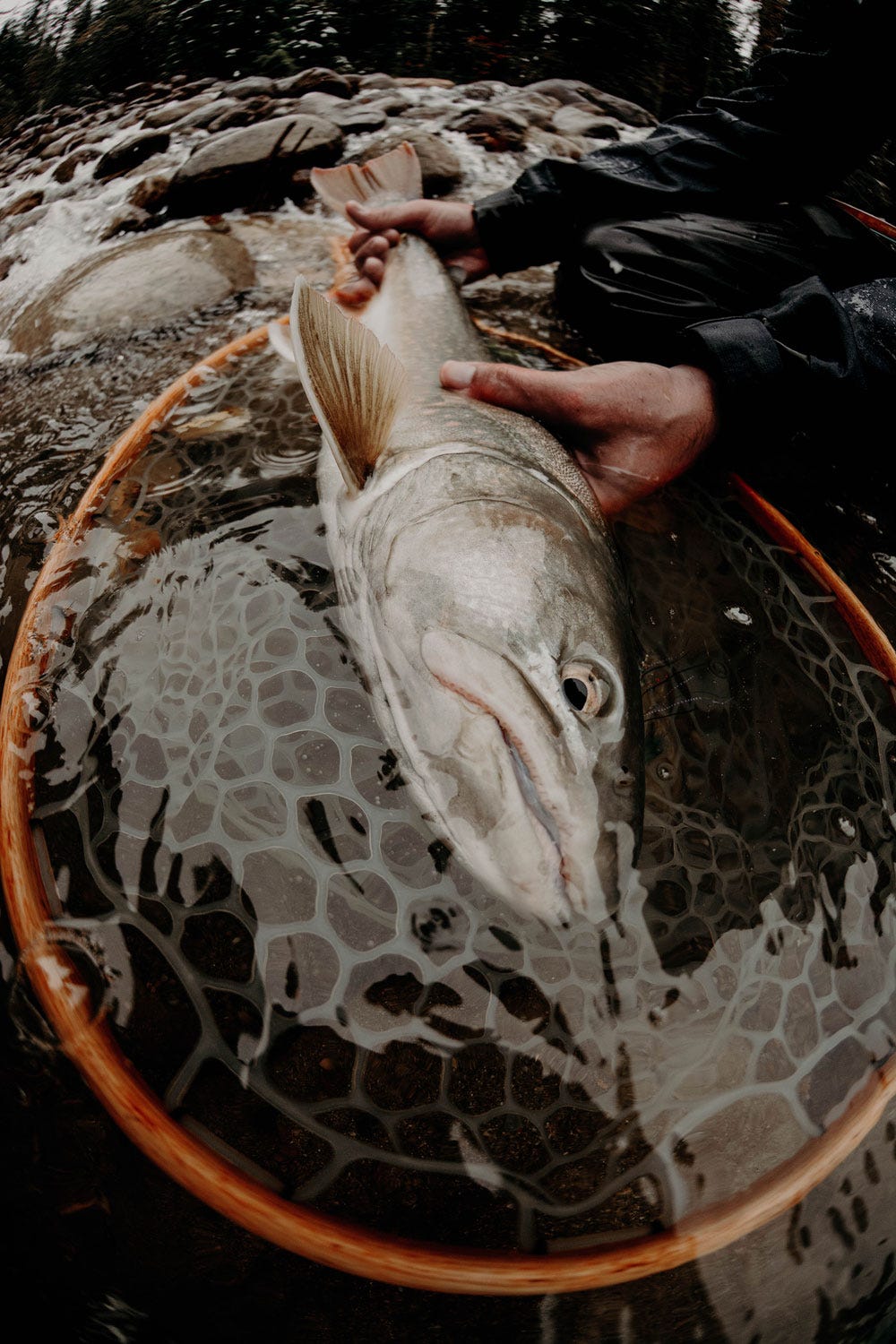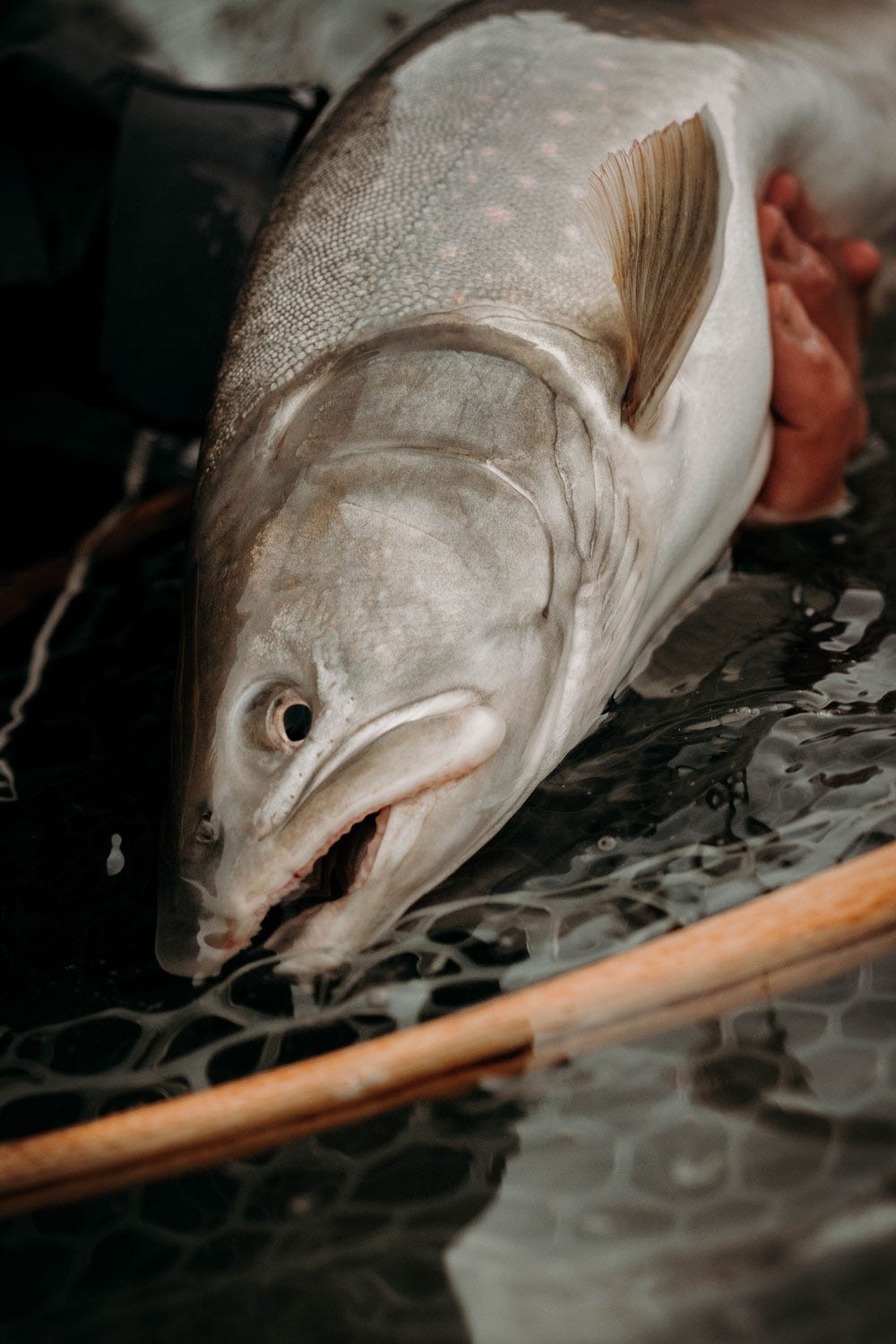 Fortunately, I hooked up on a fish just before the end of the run and I knew right away this was a different beast. The fish made a run to the middle of the river and held steady in heavy current. I slowly wound that fish back to the bank. When its belly touched a rock it shot out to mid-river again. In that milky water I never actually saw the fish until it was in the net. It was pale gray, had white-tipped fins and subtle pink spots sprinkled across its sides. I can’t remember how many inches that fish measured, but the built-in net scale registered 14. 5 pounds.