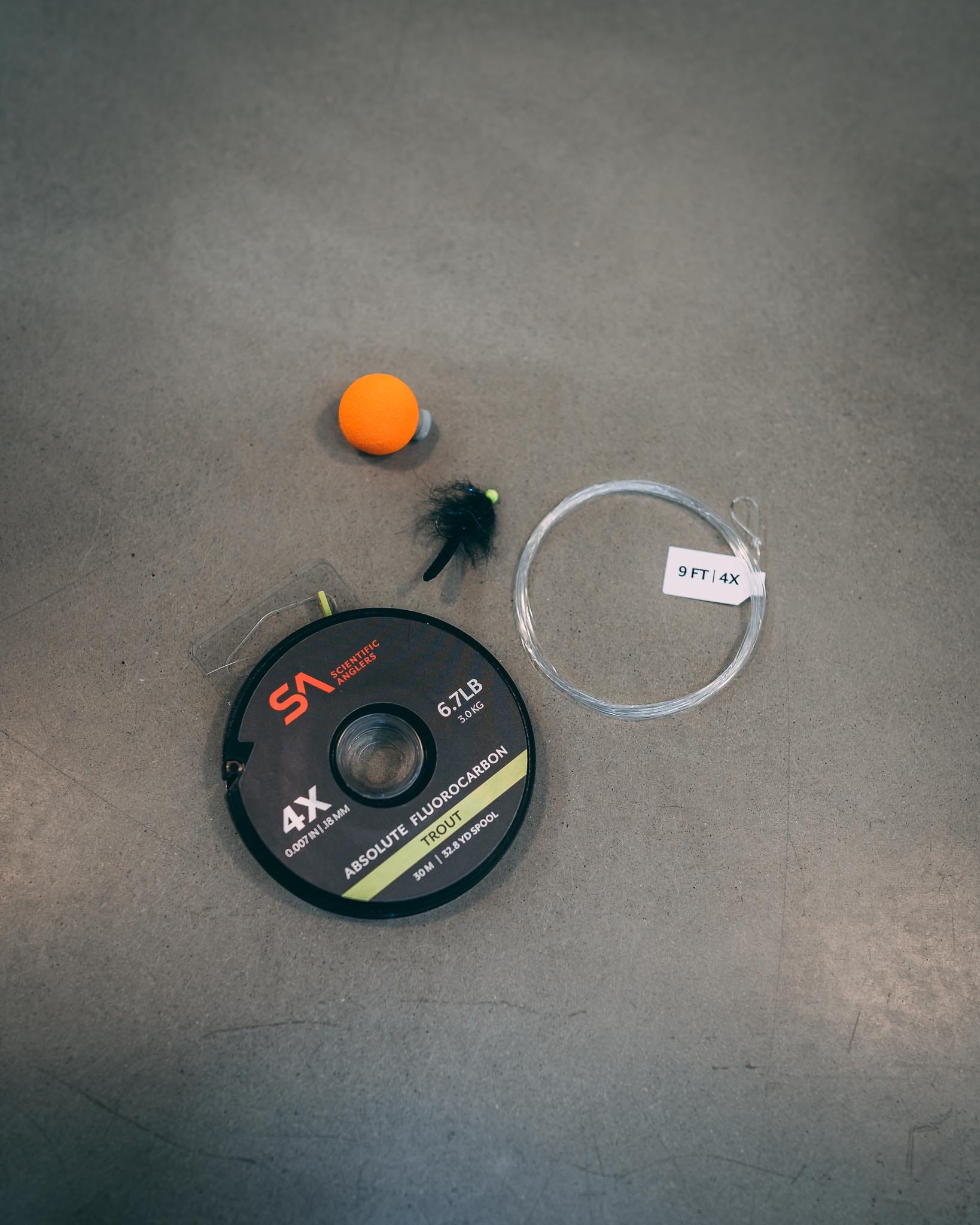 The fly rod we prefer for still water nymphing would be a 6 or 7 weight of your choice. The perfect rod, in my opinion, is The Fly Project, Project One 10- foot 6 weight. The extra foot makes accurate casts easy and mending nymph rigs effortless. The set up to this still water rig is simple, 9- foot 3x or 4x leader, an indicator and a balanced leech. Fly line to leader, leader to leech with a loop knot, and place your indicator 4-6 feet above the leech (water temps/levels depending).