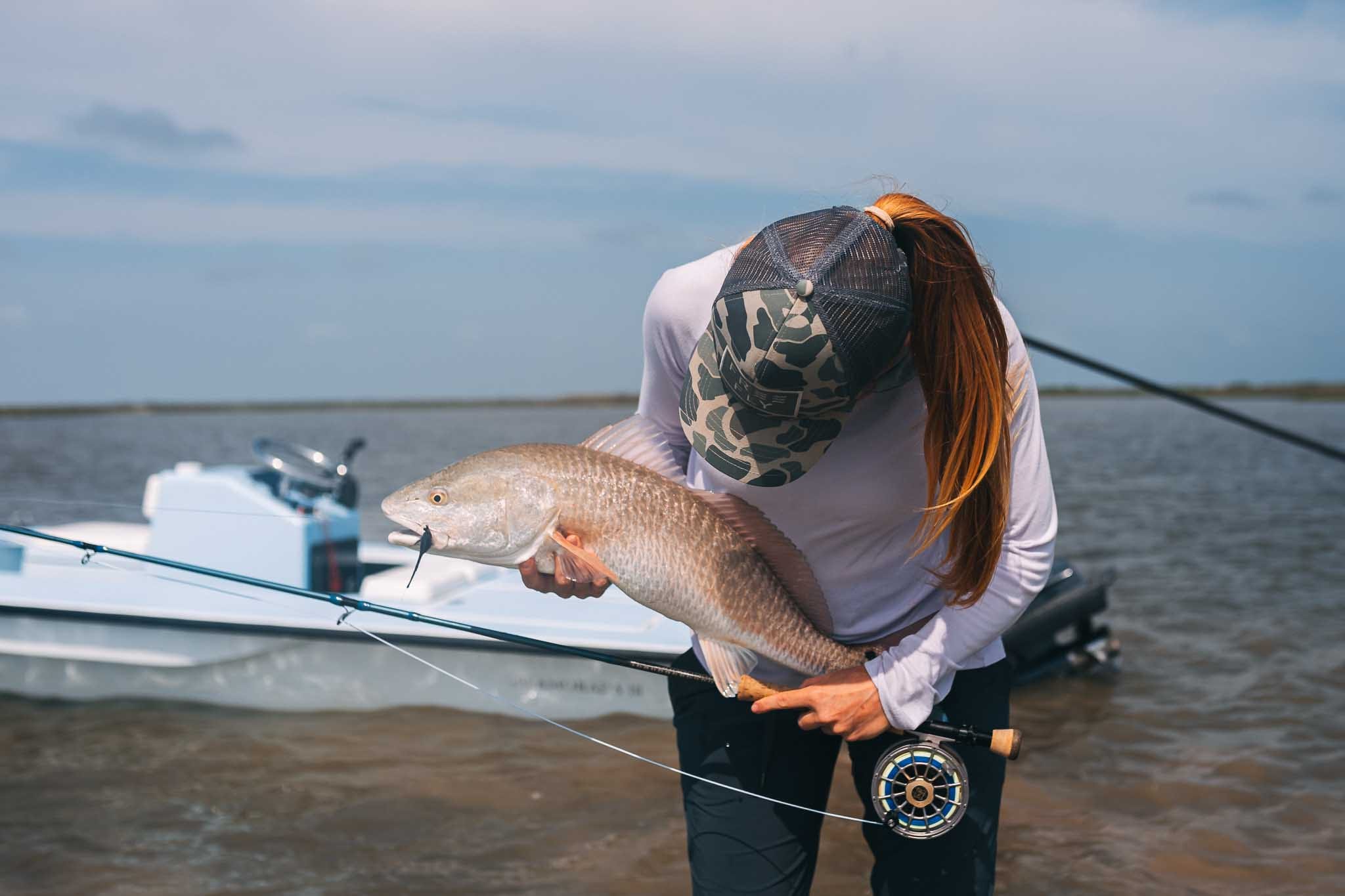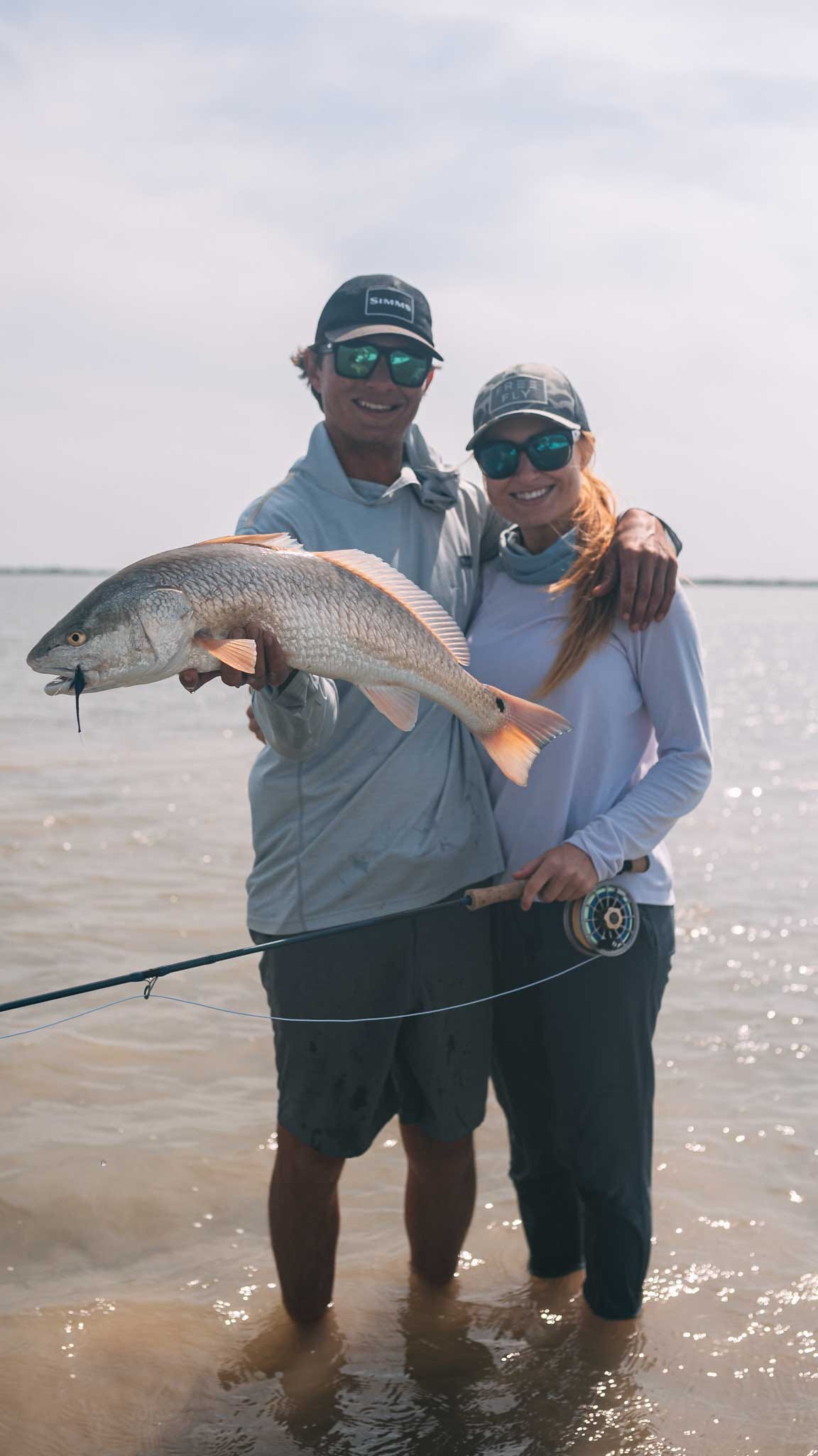 A big V pushed out from the left and we watched it closely for a while. For me, it is very difficult using the “nervous water” spotting method as there are mullet everywhere. I mean, EVERYWHERE. All the suspense ended when the fish’s tail stuck straight up like in a movie from F3T. Mason yelled, “Get out there Cierra, go get 'em!” She quietly waded toward the fish and the wind began to pick up, it would be a tough cast. Cierra struggled with her first two casts and the fly landed just behind and short of the fish. She picked up her line the third time, and fully loaded her rod, giving the fly a far lead on this big red moving in the skinny water. She took a couple of fast strips to get the fly in the fish’s path and it crushed it as soon as she intercepted that fish’s face. It was a textbook performance on her end.