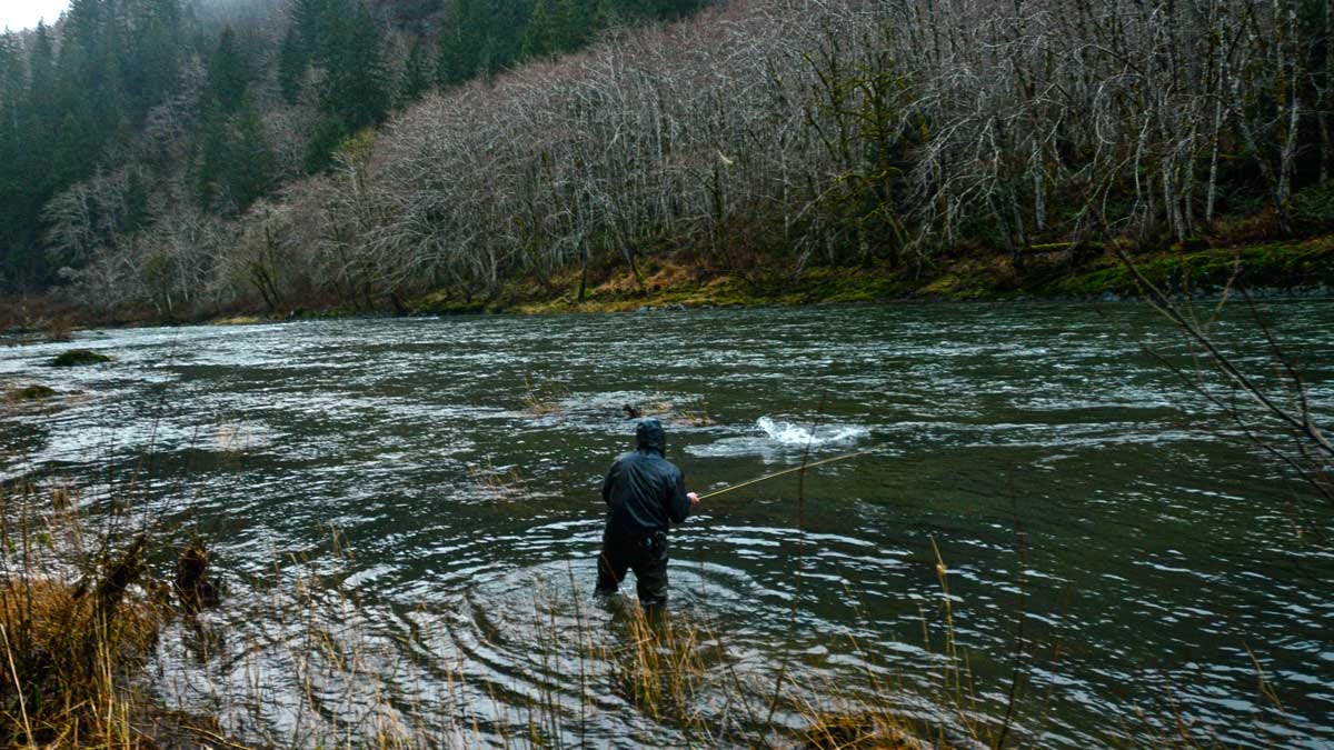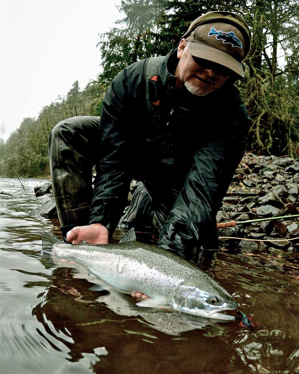 While Santella drove back to Portland that evening, I met up with the steelhead guru Jeff Hickman and nestled into a VRBO a few short yards from the beach. I’d packed some wild Alaska sockeye salmon to Manzanita and we indulged in a feast while discussing plans for the following day. At 7 a.m., we were on our way to a first-class river, hoping the water might be in shape, offering that tantalizing steelhead green. You never know. Oregon’s coast range offers dozens of quality steelhead waters, but each drainage can hold it’s own weather; one might be dry for a couple days with a river either running in shape the entire time or dropping nicely into form while another drainage, just up or down the highway, might get pummeled with rain and flood its banks right when you want to be there. But, that’s one reason Oregon is such an appealing option for winter steel—there’s a lot of water to choose from.